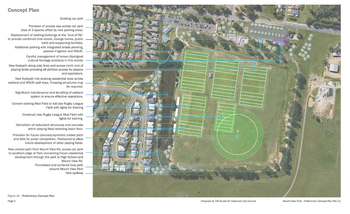 Cessnock City Council commissioned TJB Studios who have prepared a draft Concept Plan for the future development of Mount View Park. Mount View Park is a district sportsground featuring Rugby League as its primary sporting use.
