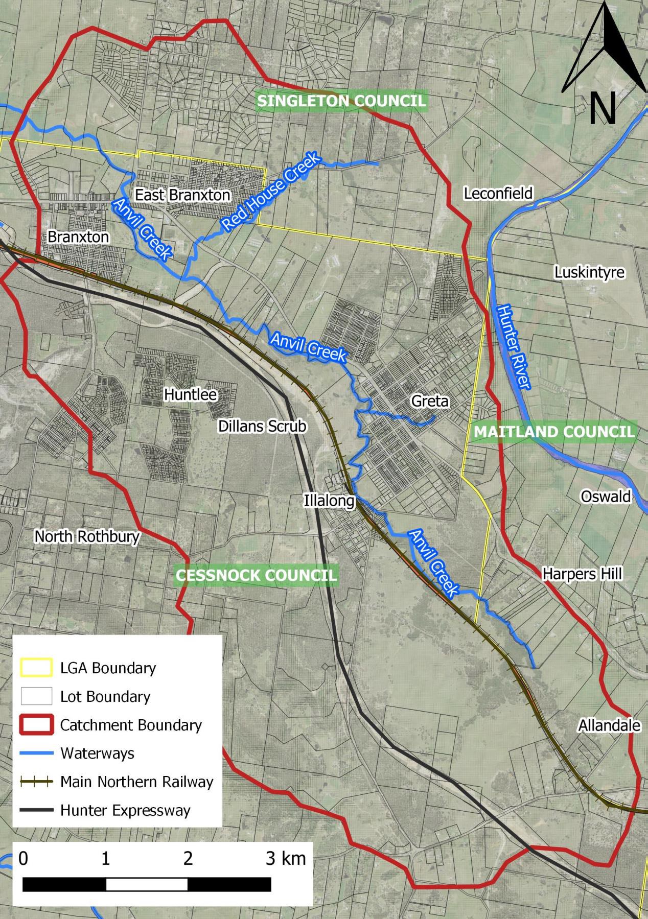 The area that this Plan applies to is the township of Greta, Branxton and surrounds. This area is approximately 47 km2 and generally encompasses the entire catchment of Anvil Creek, spanning from the Hunter Expressway Interchange with Lovedale Road down to the confluence with Black Creek.